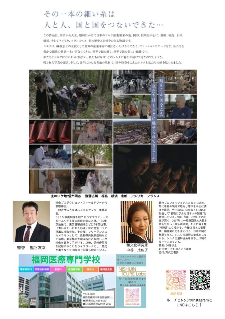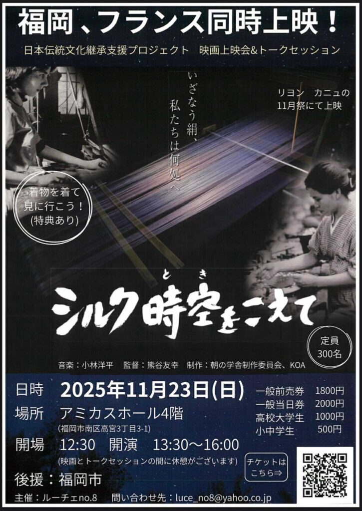 映画「シルク時空をこえて」は、11月21日から30日まで、フランス、リヨンで開催されるフェスティバル「カニュの11月祭」(カニュは仏語で絹織物職人)で上映されます。福岡市と同時上映となります。